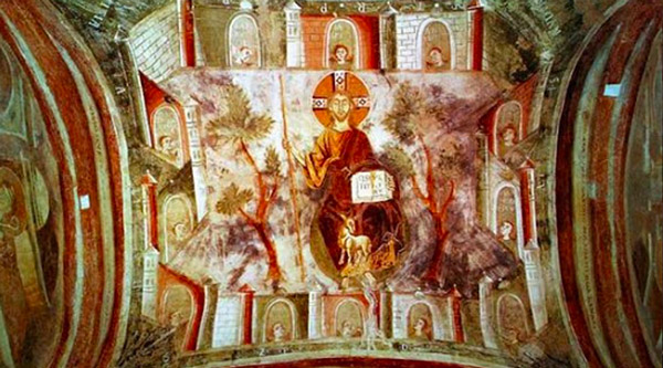 Nelle due absidiole che affiancano il corridoio d'ingresso trovano posto raffigurazioni della gerarchia degli angeli (absidiola meridionale) e dal popolo degli eletti (absidiola settentrionale). Al di sopra delle tre arcate del nartece interno, ingentilite da motivi decorativi in stucco, trova posto un unico grande affresco che riassume il senso dell'intero ciclo decorativo: la scena raffigurata rispecchia fedelmente quella descritta in apertura del capitolo 12 dell'Apocalisse.